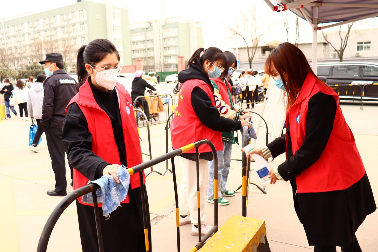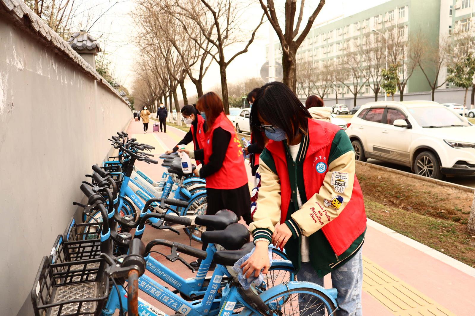 随后,志愿者们纷纷走出校门,用实际行动践行雷锋精神。大家整理校园门口的护栏以及周边共享单车,清除共享单车在车身乱贴的小广告,为每辆单车清洁除尘,并对车把手、坐垫、电子锁等易接触部位进行重点消毒和杀菌,保障校园周边卫生安全。