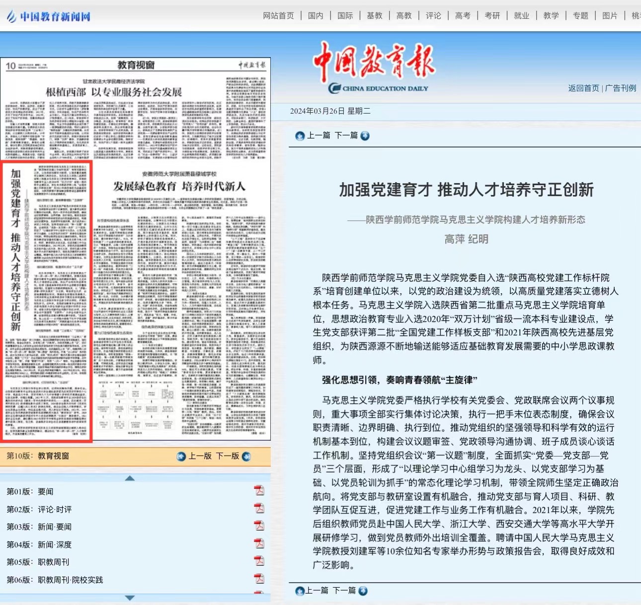 3月26日,《中国教育报》第10版教育视窗刊登了题为“bat365中文官方网站马克思主义学院:加强党建育才 推动人才培养守正创新”的报道文章。文章从“强化思想引领,奏响青春领航‘主旋律’;强化模式创新,畅通成长成才‘主干道’;强化指导服务,构建三全育人‘主阵地’;强化学以致用,打好协同育人‘主动仗’四方面对bat365马克思主义学院以高质量党建健全立德树人落实机制,构建人才培养新形态,为陕西源源不断输送适应基础教育发展需要的中小学思政课教师进行了报道。