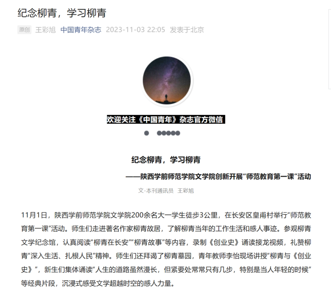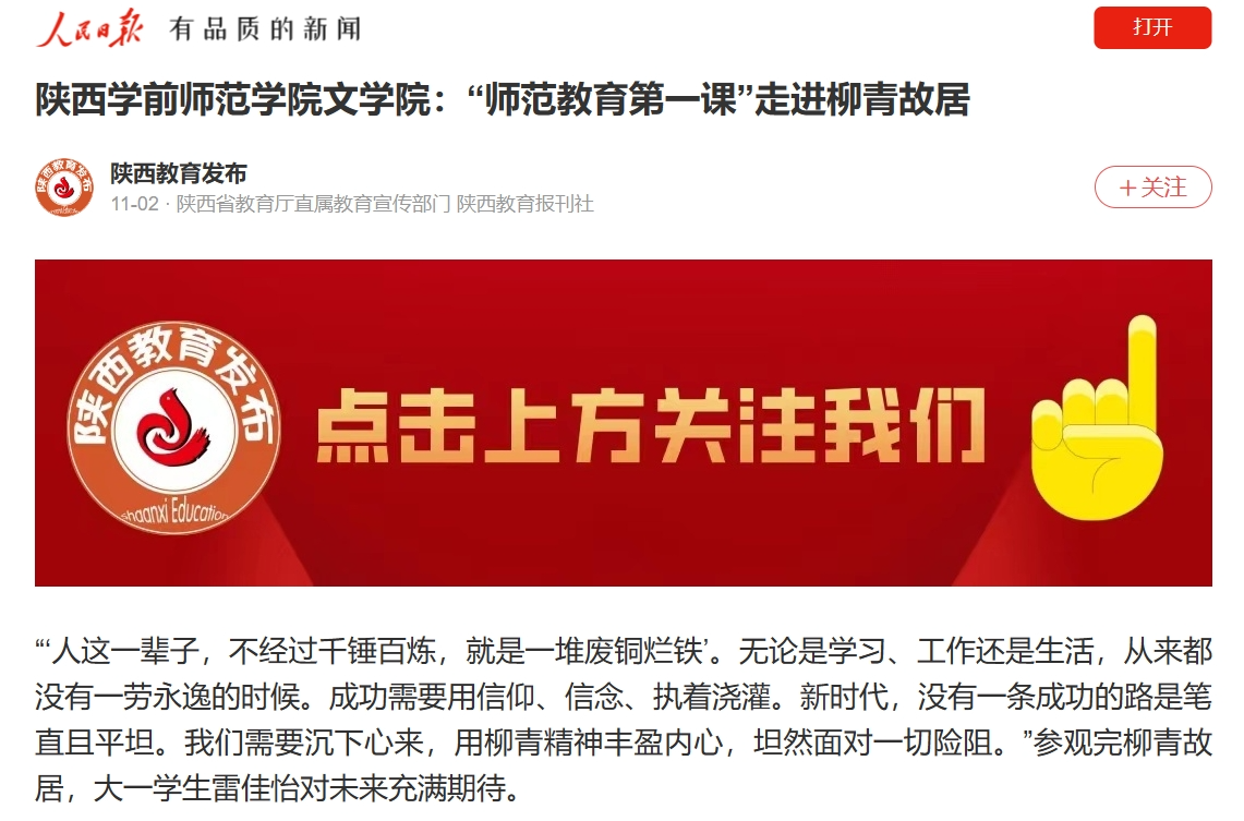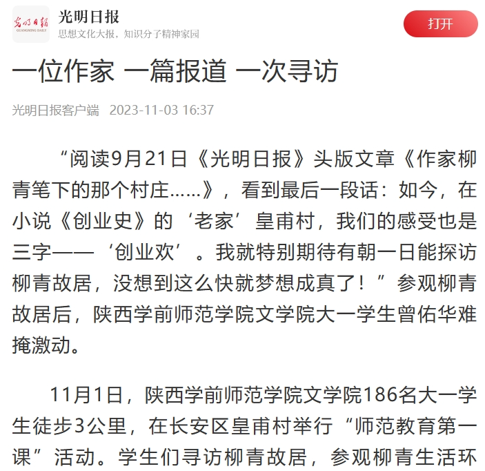 “‘人这一辈子,不经过千锤百炼,就是一堆废铜烂铁’。我们需要沉下心来,用柳青精神丰盈内心,坦然面对一切险阻。”参观完柳青故居,大一学生雷佳怡对未来充满期待。“在柳青故居授课,回到文学现场的讲解,让我找到了革命文化和社会主义先进文化的根魂,更看到了学生眼中的青春光亮;既是给学生上课,更是对我的教育。”李怡老师难掩激动。