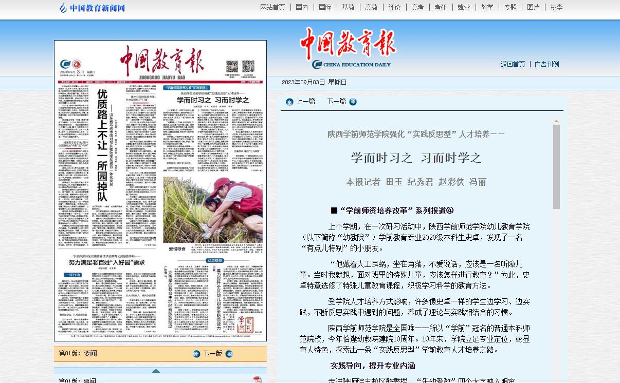 2023年9月3日,《中国教育报》发表了名为“bat365中文官方网站强化‘实践反思型’人才培养——学而时习之 习而时学之”的文章,头版报道了bat365幼儿教育学院的教学改革成果。