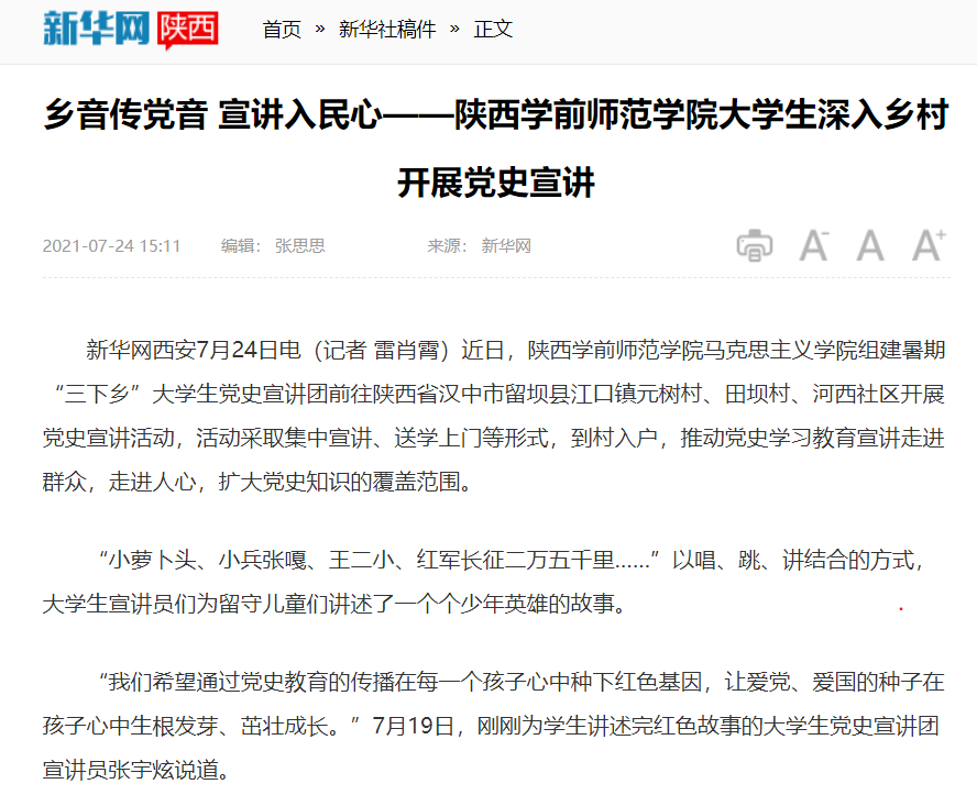 宣讲团的活动受到社会广泛关注,迄今为止,活动受到了人民日报全国党媒平台、新华社、中国网、中国教育新闻网、陕西省教育厅官方微博、陕西高校网络思想政治工作中心、国际在线、今日头条、陕西日报群众新闻网、汉中新闻网等10余家媒体的报道。截止发稿前,新华社关于我院暑期“三下乡”报道的阅读量为71.2.万人次。