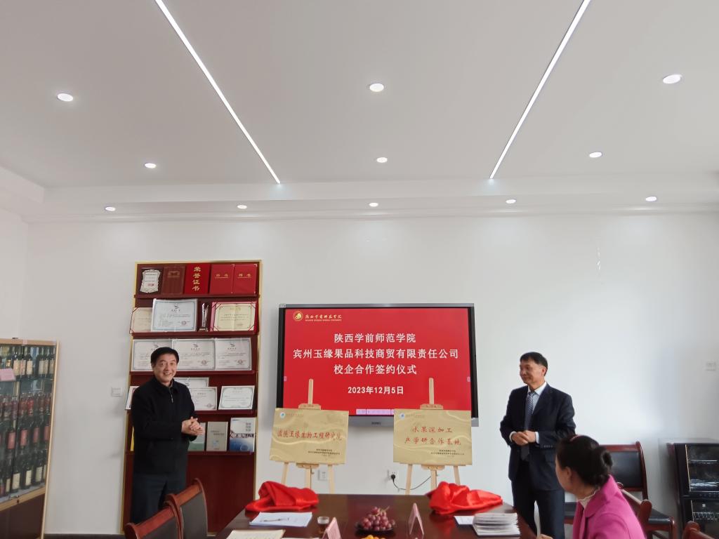 座谈会上,邵书记和张董事长共同签订校企合作协议,围绕石榴、柑橘、脐橙等水果深加工及产业化开展联合攻关研究,合同金额300万元。邵书记和张董事长为“滇陕玉缘生物工程研究院”、“水果深加工产学研合作基地”揭牌。