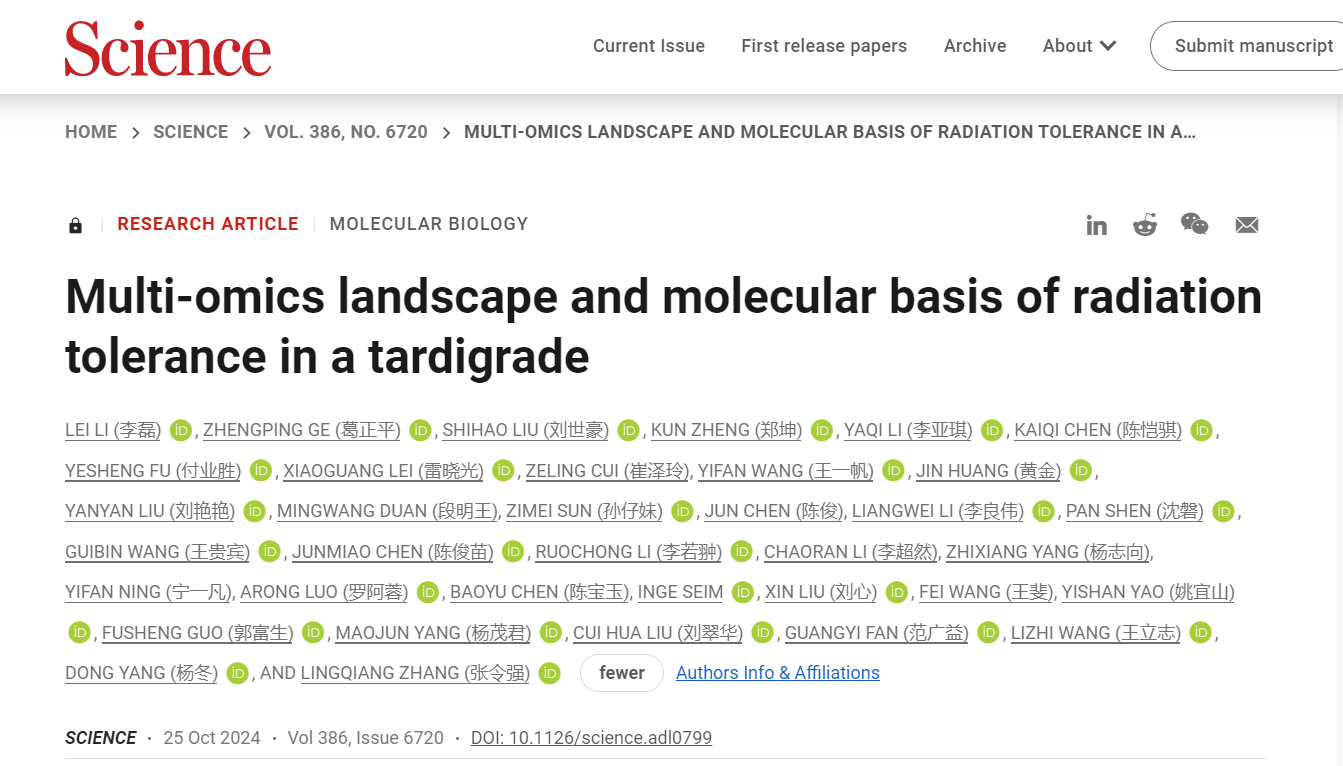 2024年10月25日,bat365生命科学与食品工程学院王立志教授科研团队,联合军事科学院军事医学研究院张令强团队和杨冬团队等国内相关研究团队在国际顶级期刊《Science》在线发表题为“Multi-omics landscape and molecular basis of radiation tolerance in a tardigrade”的学术论文。该研究首次分离鉴定了中国原生水熊虫物种——河南高生熊虫,破解了水熊虫在极端辐射下存活的关键机制,揭示了其耐受超强辐射能力的秘密,为人类抵御超强辐射损害找到了理论依据。