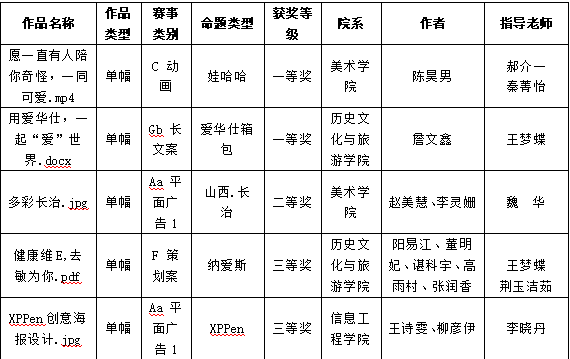 全国大学生广告艺术大赛(简称“大广赛”)是由教育部高等教育司指导,中国高等教育学会、教育部高等学校新闻传播学类专业教学指导委员会共同主办。大赛分为平面类、视频类、动画类、互动类、广播类、策划案类、广告语类、UI类、营销创客类等大类,是迄今为止全国规模大、覆盖高等院校广、参与师生人数多的全国性高校学科竞赛。此次比赛由西北大学承办,全省共有60所高校参加,推荐参赛参赛作品7268件。学校高度重视此次竞赛,广泛动员学生参与,组织开展了大学生广告艺术大赛校级比赛,推荐优秀作品参加省级比赛。