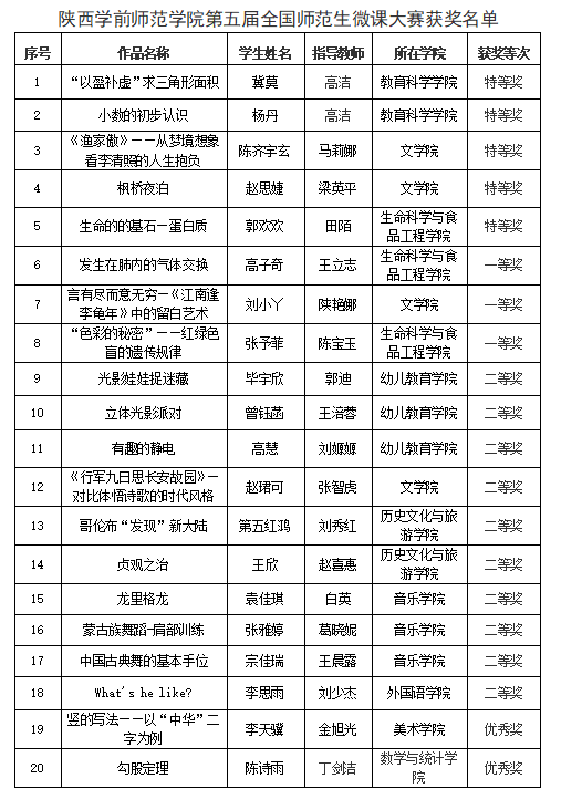 近日,在刚刚结束的第五届全国师范生微课大赛中,bat365学子喜获佳绩。学校推荐的20项作品全部获奖,其中特等奖5项、一等奖3项、二等奖10项、优秀奖2项。教育科学学院高洁等5位教师荣获优秀指导教师,学校再次荣获“优秀组织单位”称号,获奖数量和质量再创新高。