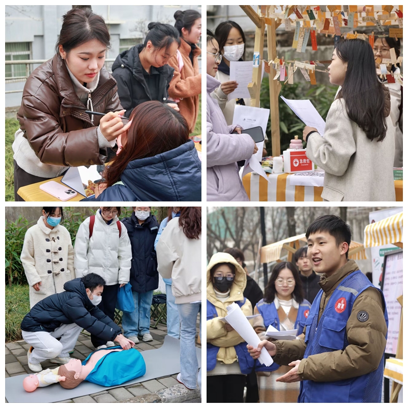 3月5日---3月6日,校青年志愿者总队、各学院青年志愿者支队结合学科专业,集中时间段在校园内开展了兼具专业特点又符合学生实际需求的特色志愿服务活动。教育科学学院青年志愿者支队发挥心理学专业特长,创设了“解忧杂货铺”项目,以禁止“蕉绿”为主题,动员参与学生填写焦虑自评量表,对其结果进行分析,同步开展心理疏导;马克思主义学院红十字会学生社团面向全校同学宣传急救知识,普及基础急救操作,以连环画的形式讲解急救方法;生命科学与食品工程学院青年志愿者支队自制降噪菊花饮、气血双补茶、祛湿茶等惊蛰节气养生茶,在乍暖还寒的早春为师院学子增添了一份温暖;化学化工学院青年志愿者支队自制眼镜清洗液,无偿为同学们清洗眼镜;经济与管理学院团学志愿者联合长安分局禁毒大队开展禁毒防艾反诈知识宣传;音乐学院青年志愿者支队组建美妆团队义务为师生化妆盘发,提升学生对彩妆艺术的认知;体育学院青年志愿者支队组织运动康复专业学生通过按摩推拿的方式,帮助同学们缓解压力,理疗体质,将中医学相关技能“零距离”送到同学身边。此次集中特色志愿服务活动共组织了17个志愿服务项目,服务师生4000余人次,在营造浓郁的学雷锋校园文化氛围的同时,真正践行了“我为同学办实事”的工作要求。