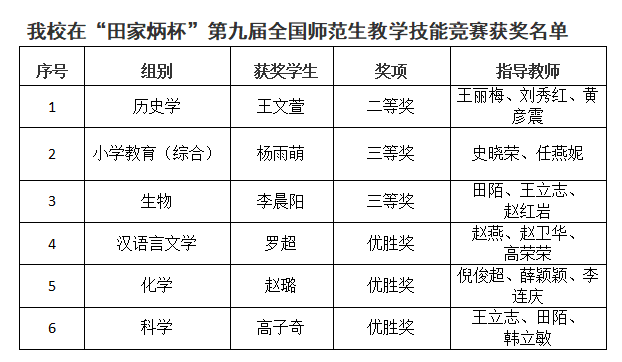 竞赛分汉语言文学、数学与应用数学、英语、物理学、化学、生物科学、思想政治教育、历史学、地理科学等9个组别,比赛内容包括教学设计、课件制作、模拟上课·板书、即席讲演四大内容,分初赛和决赛两个环节。bat365选手奋勇拼搏,凭借扎实的专业功底、过硬的教学技能和稳定的心理素质,表现出色,勇创佳绩。