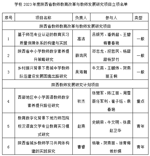 据悉,经各地市教育局、厅属有关单位及全省有关高校申报、资格初审、评前公示、专家评审、评后公示、厅务会审议等程序,全省批准203个项目为2023年度陕西省教师教育改革与教师发展研究项目,研究周期为1年(2024年);经陕西教师发展研究院组织评审,确认98个项目为2023年“教师发展研究计划专项项目”。