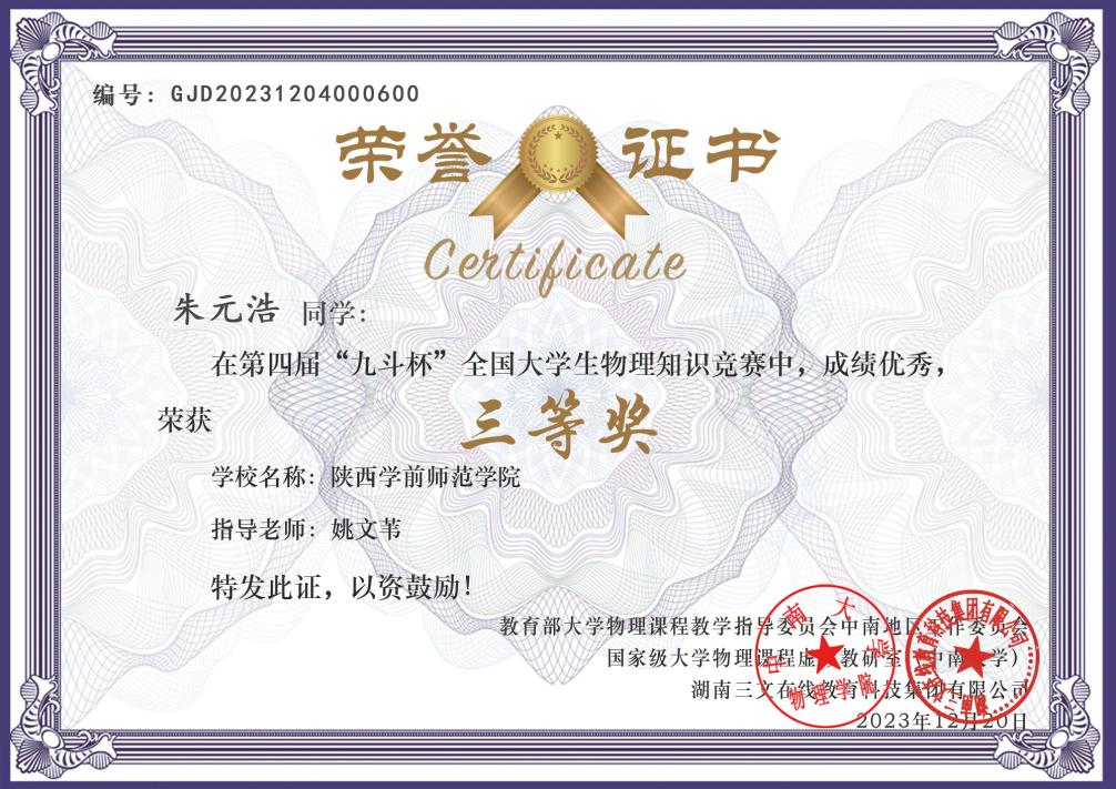 近日,由教育部大学物理课程教学指导委员会中南地区工作委员会及国家级大学物理课程虚拟教研室(中南大学)主办的第四届“九斗杯”全国大学生物理知识竞赛落下帷幕,bat365中文官方网站信息工程学院学生首次参赛并取得佳绩。经过选拔赛、区域赛、全国赛的激烈角逐,信息工程学院朱元浩同学,一路凯歌,获得国赛三等奖,为学校赢得了荣誉,实现了bat365学生在学科专业竞赛上的新突破。