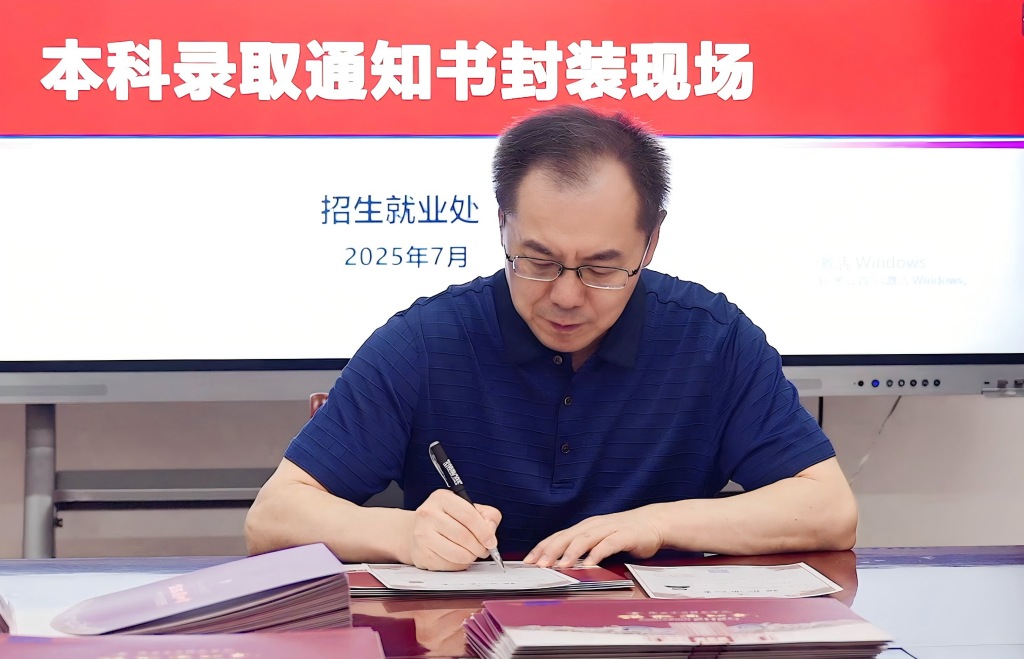 校党委书记邵必林查看2025年新生录取通知书封装情况