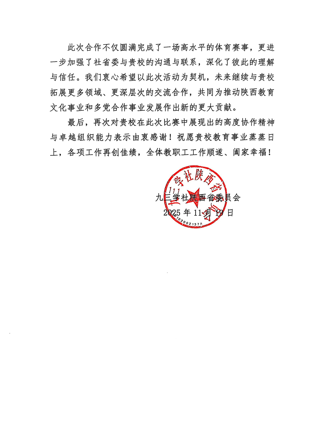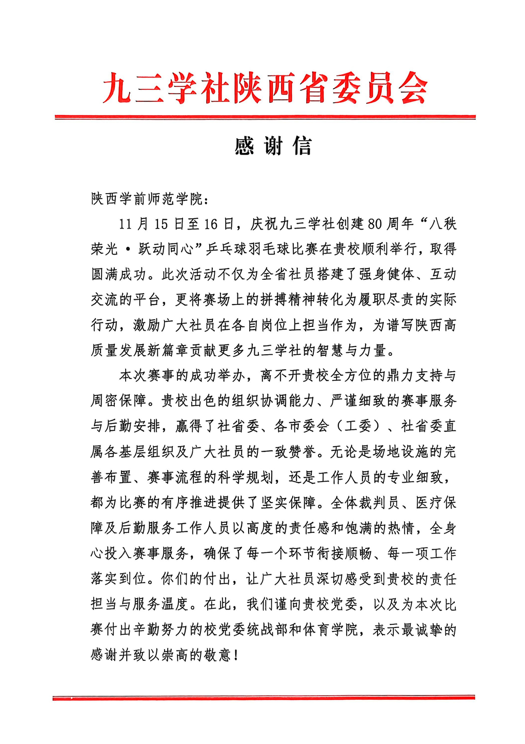 为做好赛事承办工作,学校坚持节俭办会的原则,由体育学院负责统筹组织,党政办公室、党委统战部、保卫处、后勤服务管理中心等部门密切配合,出色完成赛事的筹备组织、服务保障等工作,比赛顺利圆满完成,得到九三学社陕西省委会领导和参赛社员的高度赞誉,赛后九三学社陕西省委会专门向学校发来感谢信。