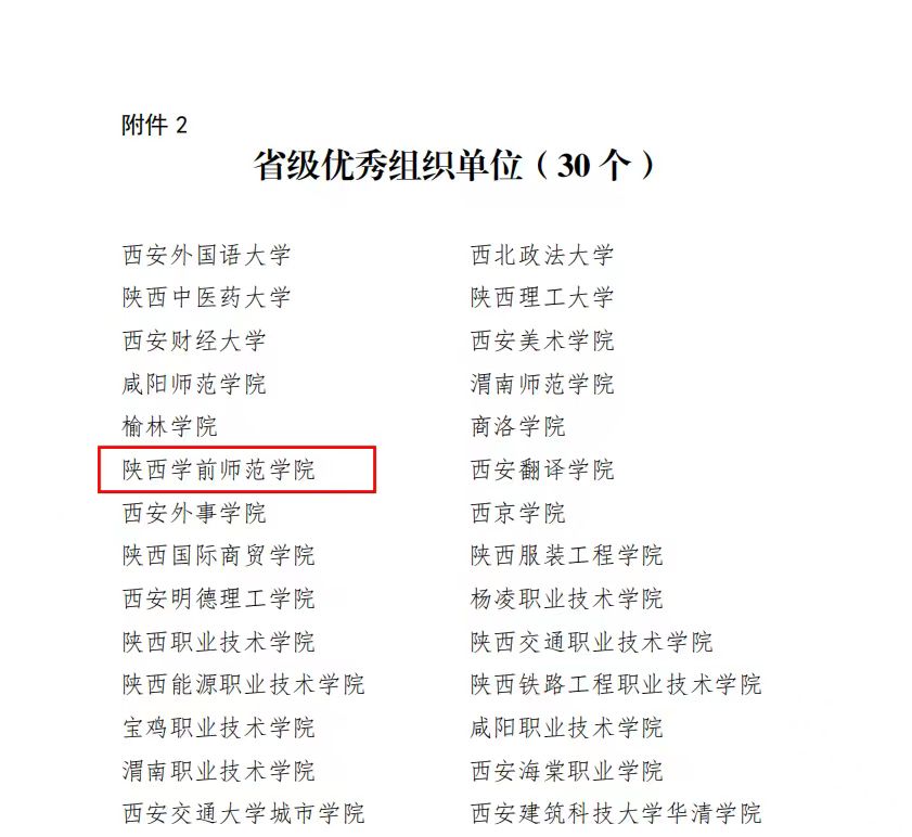 近日,省委宣传部、团省委、省教工委、省文明办、省学联联合发布了《关于2023年陕西省大中专学生志愿者暑期文化科技卫生“三下乡”社会实践活动先进集体、先进个人的通报》。学校荣获2023年陕西省暑期“三下乡”社会实践活动优秀组织单位;幼儿教育学院“师院微光 筑梦童年”实践队和生命科学与食品工程学院“乡村食育促振兴 产教融合谱新篇”实践队分别荣获省级优秀团队;程旭楠同志和张振华同志分别荣获2023年陕西省暑期“三下乡”社会实践活动先进个人称号。