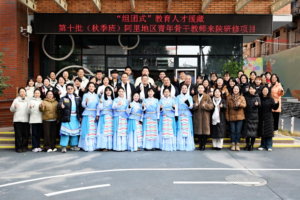 一段视频,全景式回顾了学员们104天研修期间的学习、工作与生活场景,再现了学员们成长的历程。纪录片《为了教育格桑花开得更灿烂》,总结了该项目实施十年来的做法与成效。教育培训学院党总支主要负责人汇报了第十批(秋季班)培养情况。西安市雁塔区第一幼儿园教育集团书记、园长蒋瑜代表基地学校阐述了学员“浸润式跟岗”培育历程;普兰县普兰镇多油村小学教师扎西才旦代表学员诉说收获与感恩。随后,阿里学员献上豪放欢快的《藏北双湖欢乐锅庄舞》表达对主办和承办单位的感谢,雁塔一幼师幼同台演绎《雪舞童心·春诵边陲》,藏韵与秦声交织,把气氛推向高潮。