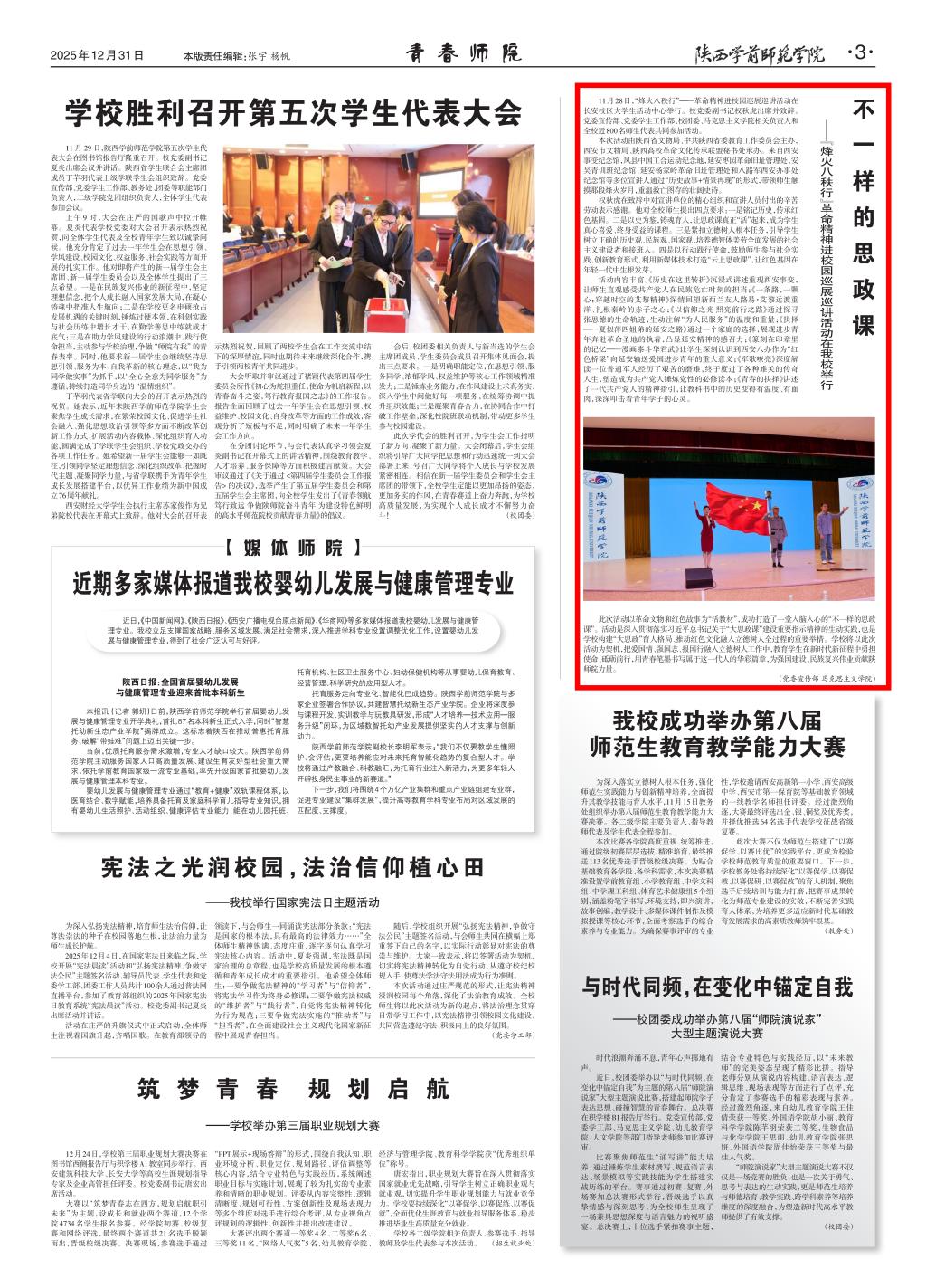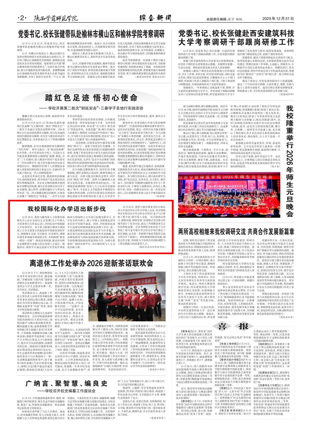 2025年,学校新闻宣传工紧扣中心,服务大局,强化思想引领。围绕立德树人根本任务策划了师生风采、我与陕师院故事等主题栏目,推出了一系列有思想、有温度、有力量的精品力作,生动展现了学校办学治校发展成就。今年是“十五五”开局之年,也是学校实施更名、申硕两大战略任务的关键一年,学校新闻宣传工作将持续深化内涵建设,提升传播效能,为传播陕师院声音、建设特色鲜明高水平师范院作出应有的贡献。