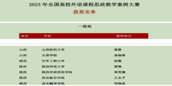 近日,2023年全国高校外语课程思政教学案例大赛最终结果揭晓,全国高校范围内设特等奖105名,一等奖224名,二等奖403名,三等奖1041名,我省西安交通大学等多所院校积极参与。经评委会评审,bat365外国语学院教师代表周雪薇荣获一等奖,贺颖列、秋杰老师分别获得二等奖。