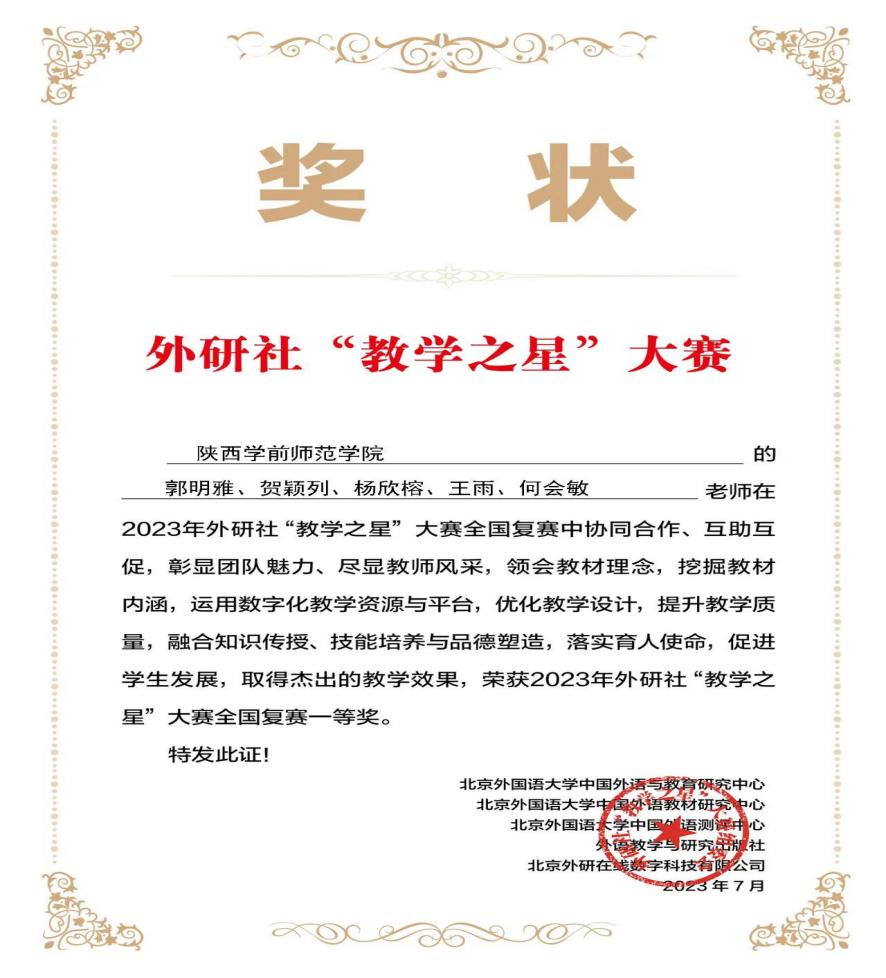 外研社“教学之星”大赛自创办以来,在全国高校外语教育领域广受认可,被连续列入中国高等教育学会“全国普通高校教师教学发展指数”。外研社2023“教学之星”大赛全国复赛于2023年6月19日落下帷幕,bat365外国语学院英语专业教学团队、大学英语教学团队从全国340个参赛团队中脱颖而出,取得突破性佳绩,喜获全国复赛两个一等奖。这是继2022年bat365大学英语教学团队获得此项赛事全国复赛一等奖之后所取得的又一大教师参赛佳绩。