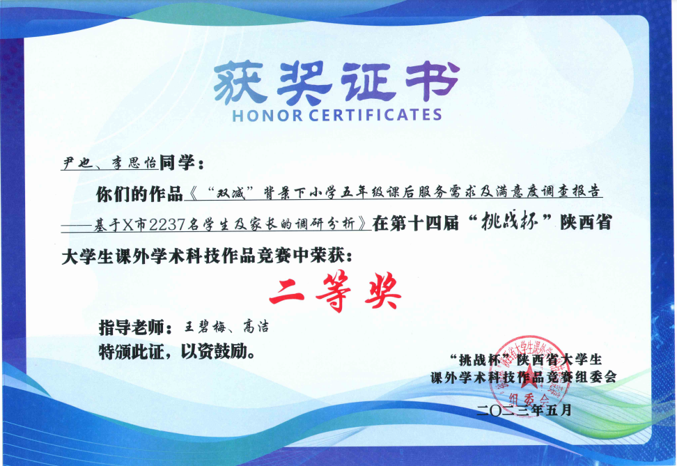 5月20日,第十四届“挑战杯”陕汽集团陕西省大学生课外学术科技作品竞赛闭幕式暨颁奖仪式在长安大学圆满落幕。在此次竞赛中,bat365推荐参赛作品荣获二等奖2项。本届竞赛自2月份启动以来,共有80所高校的878件作品报名参赛,参赛高校和作品数量均创新高。为了做好省赛的备赛工作,学校于3月启动校级选拔赛事及红色专项活动的组织动员工作。经二级学院推荐、校外专家评审,学校最终推选13件作品参加省赛评审环节。经过竞赛组委会资格审核、网评等步骤,来自数学与统计学院梁瑞蜓、孙惠慈、张筱璇、马瞾、高佳琪等五位同学的作品《爸妈眼中的“双减”---西安市小学家长对“双减”政策的认知情况调查与分析》,教育科学学院尹也、李思怡同学的作品《“双减”背景下小学五年级课后服务需求及满意度调查报告---基于X市2237名学生及家长的调研分析》进入省赛终审决赛。5月7日,在终审答辩展示环节,梁瑞蜓、尹也等同学组成的答辩团队,在张萌、王泽华、王梦蝶、王碧梅、高洁等诸位指导教师的悉心辅导下,制作作品展示交流展板,机智应对评委专家的现场问辩,缜密阐述作品相关信息,顺利完成决赛答辩相关事宜,获得决赛评审专家一致好评。