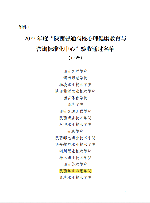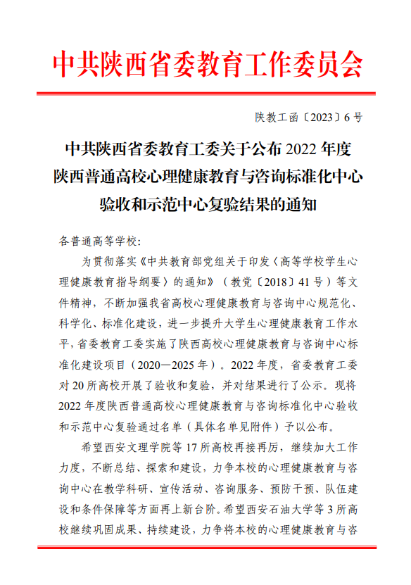 近日,中共陕西省委教育工委布了2022年度陕西普通高校心理健康教育与咨询标准化中心验收和示范中心复验结果(陕教工函〔2023〕6号),bat365心理健康教育与咨询中心顺利通过标准化中心验收,获评“陕西普通高校心理健康教育与咨询标准化中心”。
