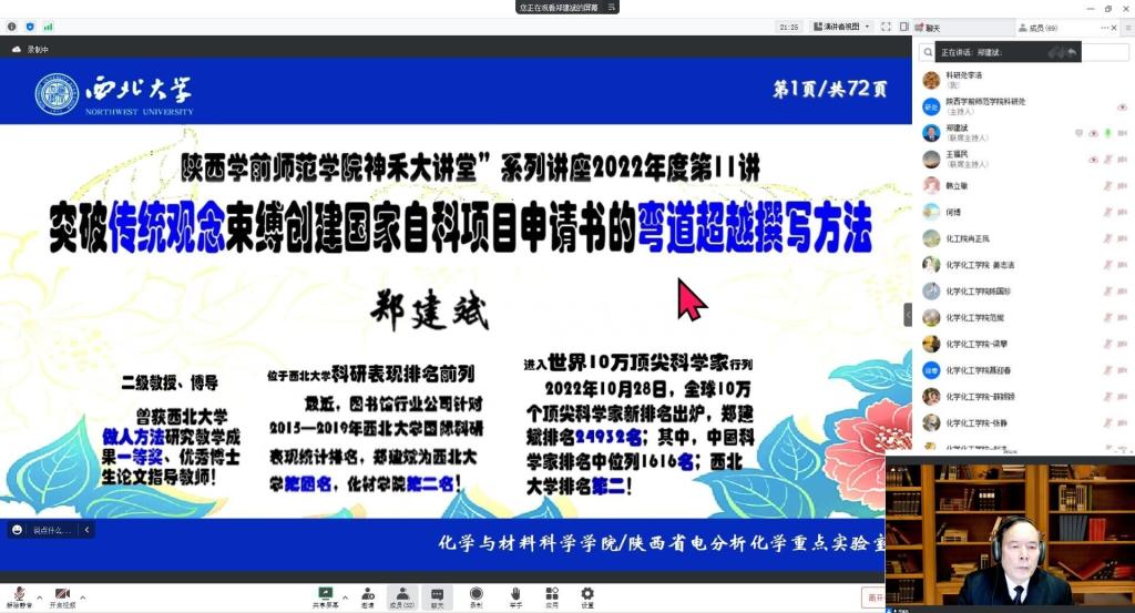 12月1日下午2点,由学科建设与科研处主办的“神禾大讲堂”系列讲座2022年度第11讲通过腾讯会议线上举行。学科建设与科研处邀请西北大学教授、博士生导师郑建斌作了题为《突破传统观念束缚创建国家自科项目申请书撰写的弯道超越新方法》专题报告。经济与管理学院、生命科学与食品工程学院、信息工程学院、数学与统计学院、化学化工学院70余名教师聆听了报告。报告会由化学化工学院王福民教授主持。