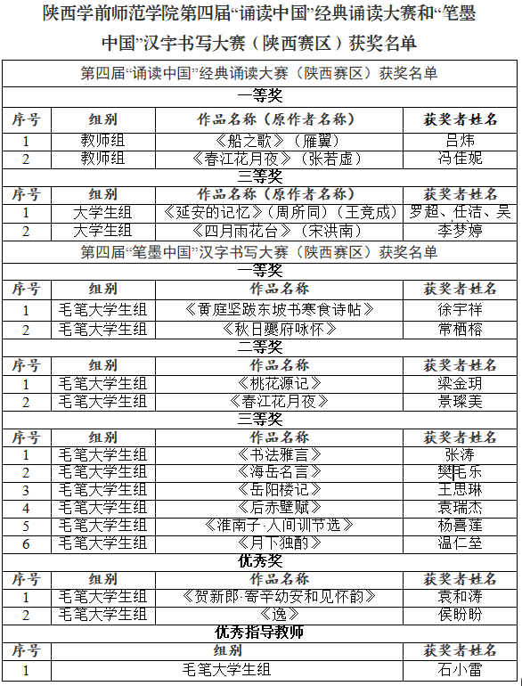 近日,陕西省教育厅公布了第四届中华经典诵写讲大赛(陕西赛区)评选结果。bat365师生在“诵读中国”经典诵读大赛中喜获一等奖2项、三等奖2项,在“笔墨中国”汉字书写大赛中喜获一等奖2项、二等奖2项、三等奖6项、优秀奖2项,美术学院石小雷老师荣获优秀指导教师,学校荣获“优秀组织单位(诵读、书写)”,获奖数量、类型位居省属高校前列。