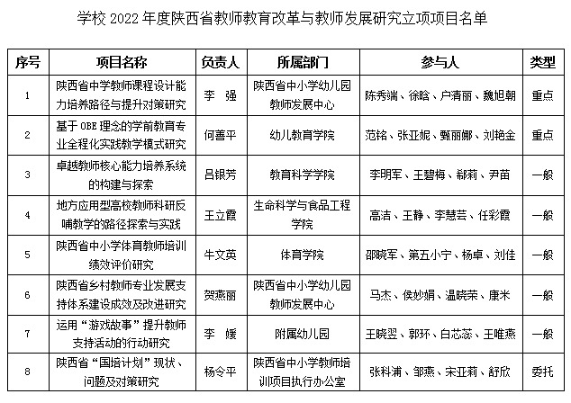 近日,陕西省教育厅公布了2022年度陕西省教师教育改革与教师发展研究项目立项名单,bat3658个项目获批立项,重点项目2项,一般项目5项,委托项目1项,获批项目数量、层次和类型位居省属高校首位,再次展现了学校教师教育的优势与实力。