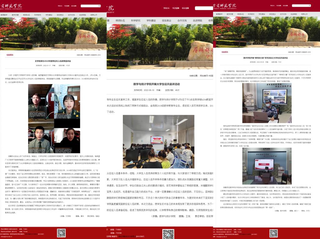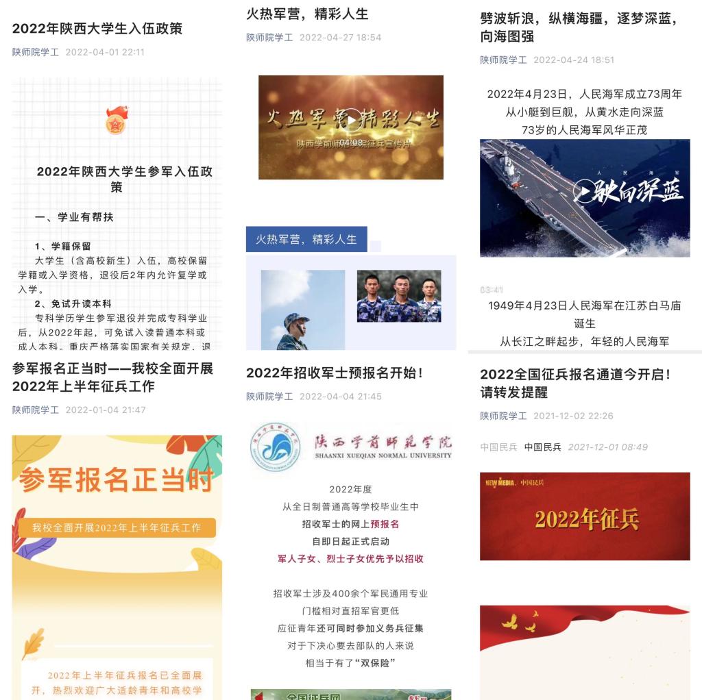征兵宣传全方位。为充分发挥好“新媒体矩阵”宣传辐射优势,学校采用多种新媒体宣传平台发布征兵相关政策和工作动态,点对点向全校每一位毕业生推送征兵报名通知、征兵报名流程、征兵政策解读等;通过校园网、微信公众号、校园广播、电子显示屏等进行征兵宣传,在校园醒目位置张贴宣传海报和条幅,印制发放《bat365中文官方网站征兵宣传手册》等;筹划制作了征兵宣传片《我们在军营等你》,并被陕西省征兵办公室官方平台头版头条转发,全方位、立体化进行征兵宣传,营造参军入伍的浓厚氛围。