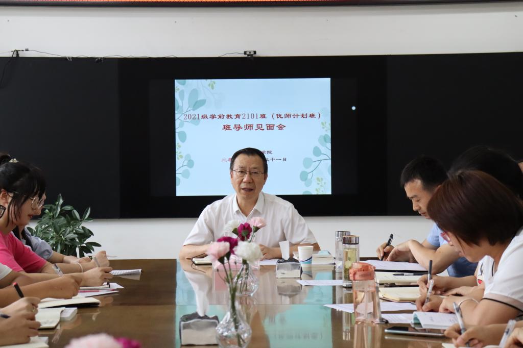 为进一步落实立德树人根本任务,提升“三全”育人的实效,将学校领导干部联系班级制度落到实处。5月31日下午16:00,在幼儿教育学院307会议室举行校领导联系班级见面会。校党委书记付建成与所联系班级-----幼儿教育学院学前教育专业2021级2101班(优师计划班)进行见面会。幼儿教育学院院长何善平、院党委书记(主持工作)王继康、院党委副书记苏群、辅导员段海燕出席班会。会议由2101班(优师计划班)学生张子怡主持。