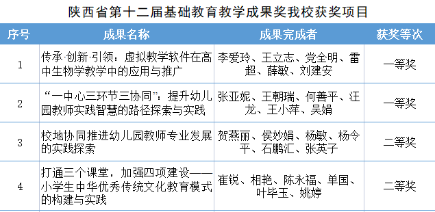 陕西省基础教育教学成果奖是对省内基础教育教学研究和实践成果的集中检阅和展示,每两年评选一次,是我省基础教育领域的最高奖项。学校高度重视成果奖申报工作,提前规划部署,积极召开答辩论证会,邀请校内外专家对申报奖项进行了论证和指导,有效保障了申报的教学成果的质量和竞争力。本次各获奖成果基础工作扎实,创新性和实践性突出,发挥了良好的引领示范作用。