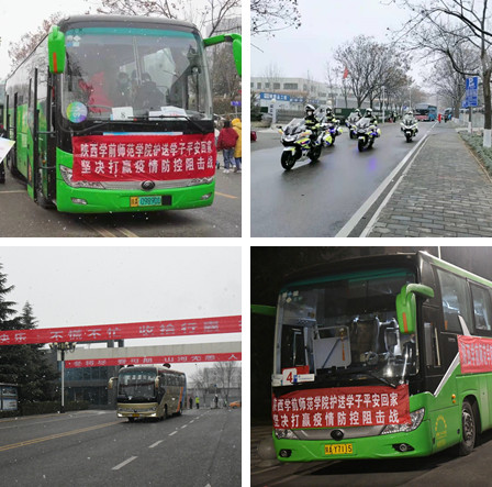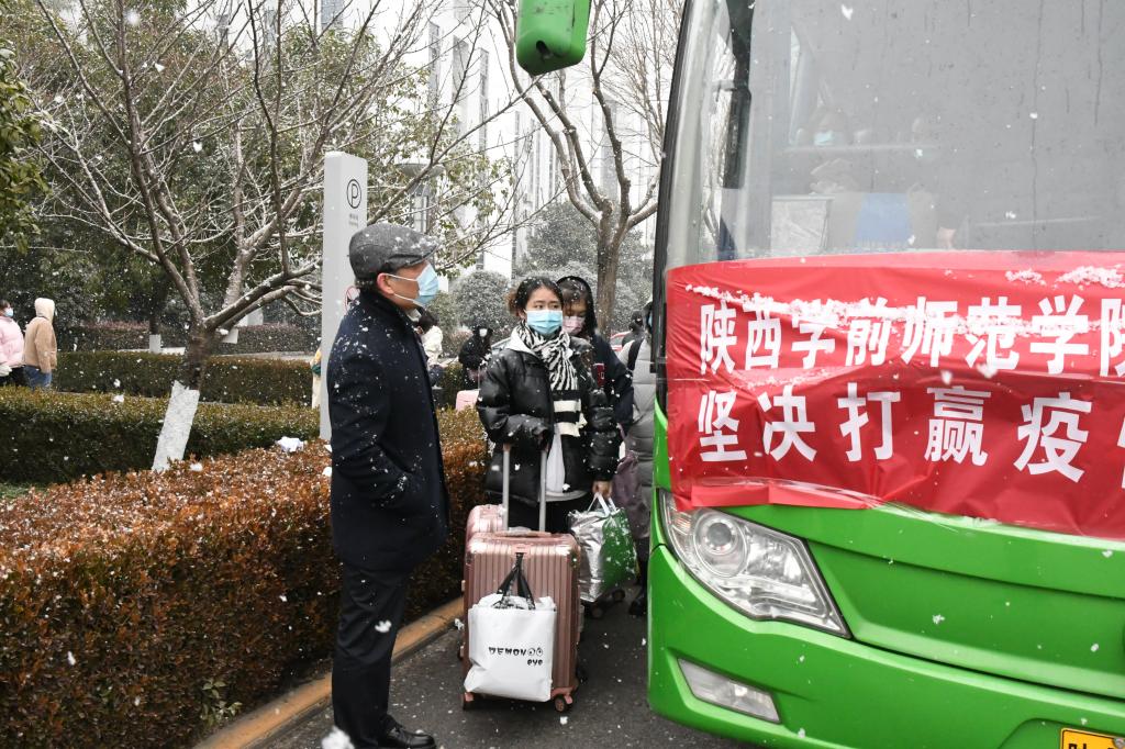 学校成立了2022年寒假工作领导小组和学生离校返家工作专班,下设综合协调、车辆保障、安全保卫、核酸检测、“两站一场”等八个工作组以及十一个学生转运组。在学校的统筹安排下,工作专班及各工作组立即投入工作,大家分工协作,密切配合,连夜完成全校学生离校返家信息台帐,积极与各市、县(区)教育局和运输部门对接沟通,协调联系运输车辆和点对点闭环接送学生的具体方案,积极协助学生购买车票和机票等。工作专班和各工作组根据西安市疫情防控风险等级随时调整、学生离校返乡方案临时多变等诸多情况,不分昼夜开展工作,发扬连续奋战的作风,连续一周以来,学校领导和工作专班、各工作组的全体成员、后勤保卫工作人员、广大教师和师生志愿者顶风冒雪、废寝忘食投入到离校返乡学生的组织、转运和保障工作中,由学校组织车辆“点对点”闭环管理送至市内“两站一场”。校园内外、火车站、高铁站、机场每个地方都留下了为返乡学生送行的身影和一幕幕感人至深的场景。学校领导和教职员工的辛勤付出,日夜奋战、暖心服务,只为全力护送同学们平安顺利返家。为了确保学生转运和离校返乡平稳有序,学校提前为学生开具了《大中专学校寒假放假学生离校返家证明》,组织学生开展核酸检测和防疫专题教育活动,为学生发放个人防护物资,提醒做好沿途个人防护,并全程动态监控每位学生的返程信息。学校的暖心服务、老师的贴心嘱托、志愿者的热情帮助,温暖了师院学子的返乡之路。对于熬了好几个通宵的老师们来说,学生顺利返家,就是对他们最大的慰藉:“当收到一个个学生打来电话、发来消息说他们顺利到家的时候,感觉我们所有的付出都是值得的。”