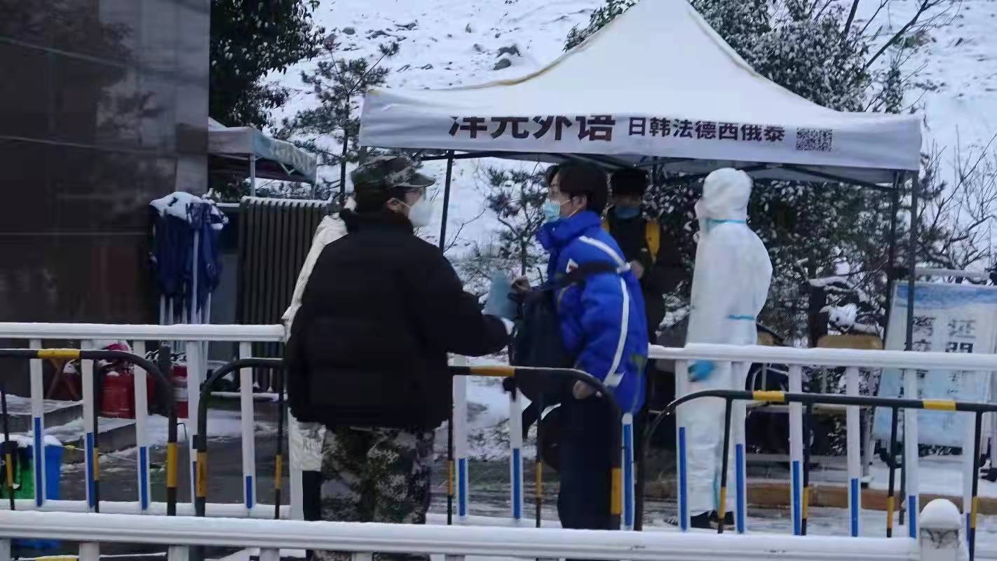25日清晨,漫天飞雪令整个西安银装素裹,疫情之下辛苦备考的同学们正在体验一段不平凡的赴考之路。为了让每一名在bat365考点参加考试的考生都能顺利参加考试,师院人尽心尽力为考生提供服务。亮码、测温,出示48小时核酸阴性证明、准考证和身份证、人脸识别,考生们进入考场的秩序有条不紊,开考情况平稳有序。志愿者们不畏寒冷,不畏风雪,用行动诠释了“疫情就是命令,防控就是责任”。