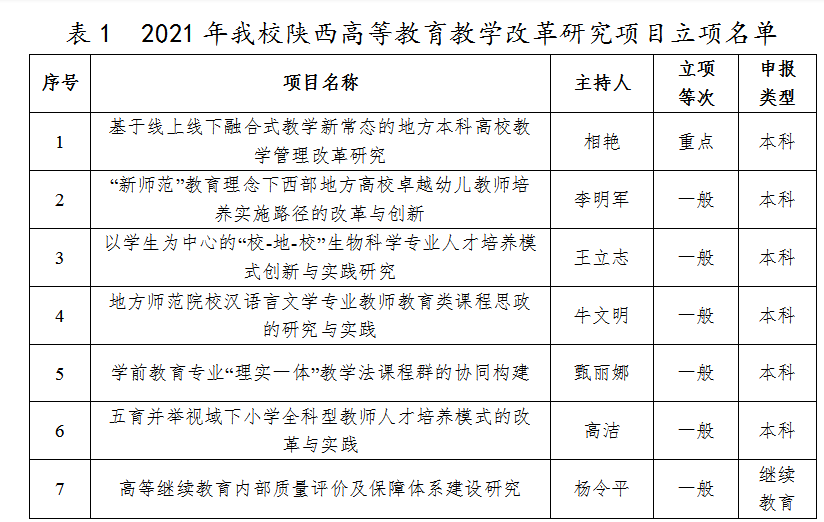 近日,陕西省教育厅正式公布了2021年度陕西本科和高等继续教育教学改革研究项目立项结果,全省共批准立项441个项目。bat365以第一申请单位获批项目7个,其中重点项目1项,本科一般项目5项,继续教育一般项目1项。同时,学校以主要完成单位参与申报项目2项。获批项目数量和质量均创历年新高。