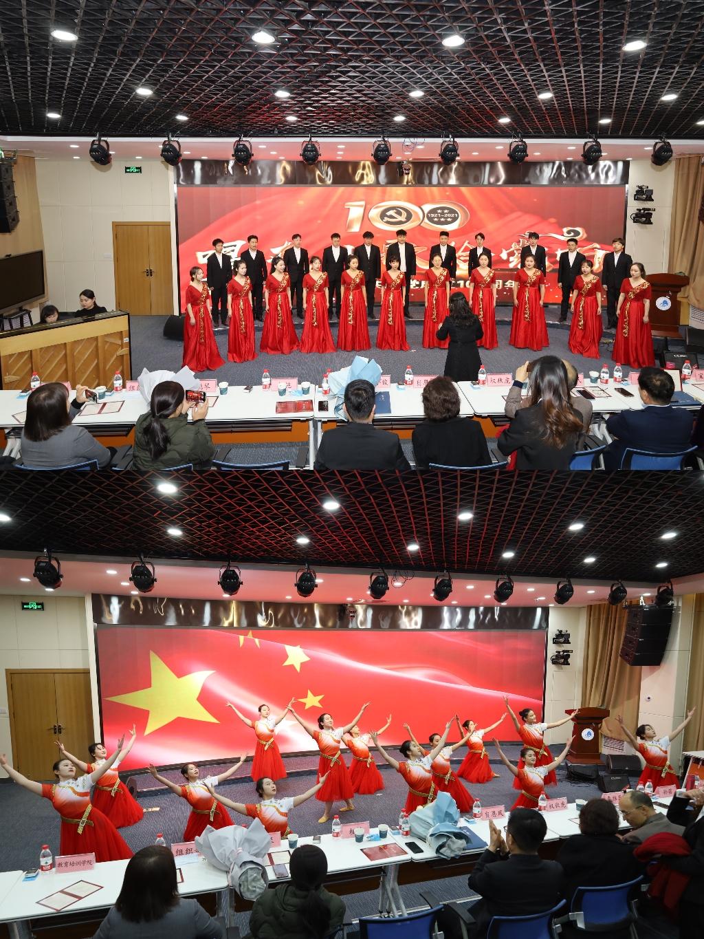 本活动通过主旨报告、故事分享、朗诵、书法、舞蹈、大合唱等多种舞台艺术形式,立体展现了百年红色经典的精髓,深情回顾了中国共产党建党百年的峥嵘岁月和光辉历程,加深了师生对于“红色经典”的理解和感悟,团结引领师生党员听党话、感党恩、跟党走,激励了广大师生学史明理、学史增信、学史崇德、学史力行,持续昂扬奋斗,凝心聚力迈进新征程,在党的十九届六中全会号召下,弘扬伟大建党精神,勿忘昨天的苦难辉煌,无愧今天的使命担当,不负明天的伟大梦想。永远跟党走,赢得更加伟大的胜利和荣光!