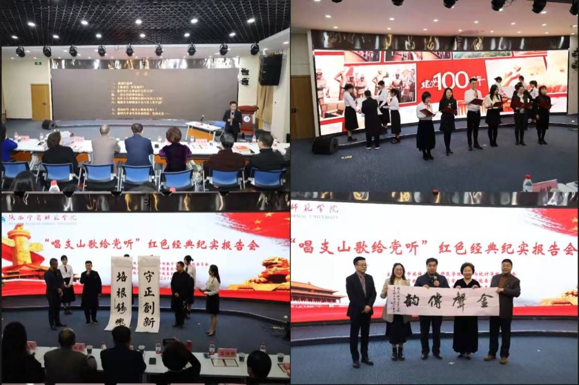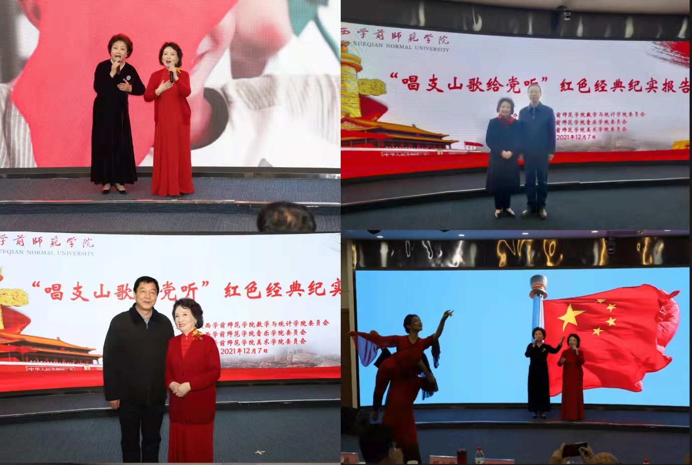 八十二岁高龄的贠恩凤教授一袭红裙、精神抖擞,携女儿孙蓓女士登台演唱红色经典代表作《唱支山歌给党听》,在老艺术家的深情演绎下,一幕幕党史画卷徐徐展开,师生共同回顾峥嵘党史,重温中国共产党百年初心使命,歌声道出了人民群众对党的无限感恩与深情以及对祖国的无限热爱与赤诚,全场掌声不断响起,报告会在贠教授歌声中拉开帷幕。