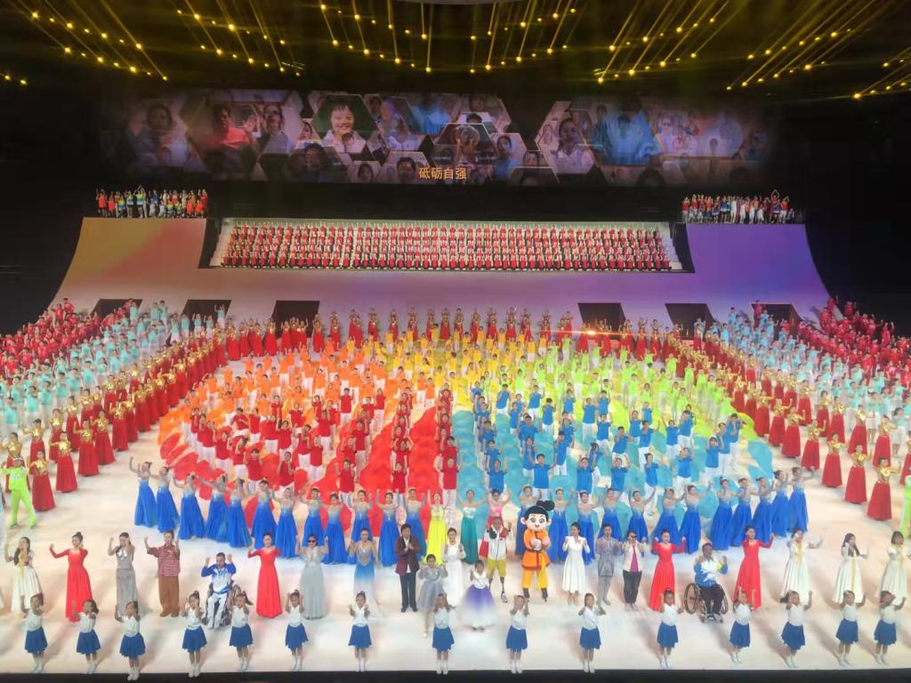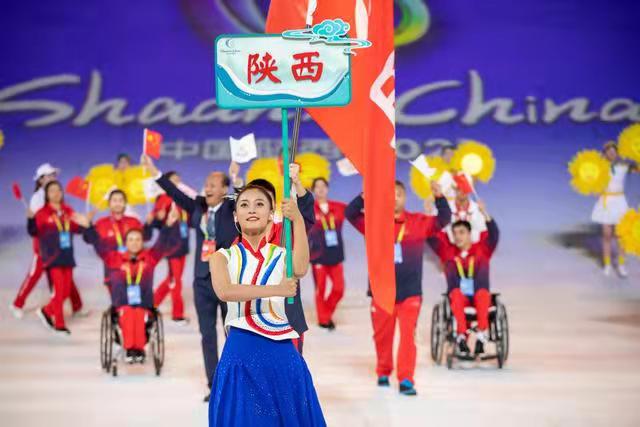 中华人民共和国第十一届残疾人运动会暨第八届特殊奥林匹克运动会于2021年10月22日晚8时在西安奥体中心举行开幕仪式。中共十九届中央政治局委员,国务院副总理孙春兰出席并宣布运动会开幕。在残特奥会的举办过程中,bat365中文官方网站200余名学生演员参与了尾声节目《心中有光》主题曲的表演。该节目主要展现了残疾人砥砺自强、拼搏奋进的昂扬人生姿态。除此之外,bat365还有8名仪式引导员,9名管理教师参与到活动之中。音乐学院任雨萌同学被仪式演出组和总导演一致选定为东道主“陕西”代表团的仪式引导,同其他6名学生(天津、辽宁、贵州、香港、湖南、黑龙江)出色完成开幕式上运动员代表队的引导工作。