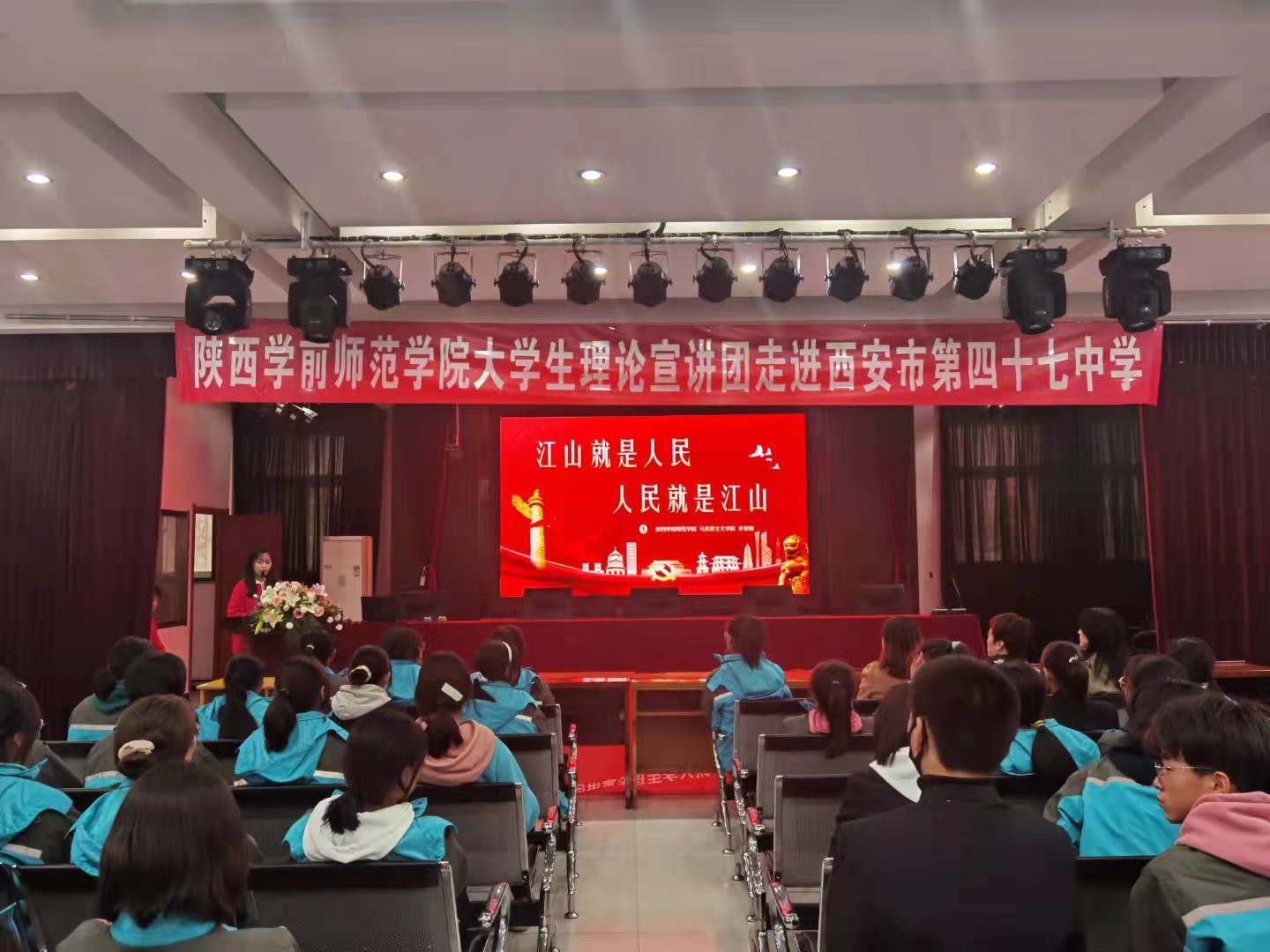 10月14日,马克思主义学院大学生理论宣讲团受邀来到西安市第四十七中学开展学习“七一”讲话精神之“青年学子如是说”专题宣讲活动。西安市第四十七中学德育主任、年级组长、高一年级共计200余名学生聆听了本场宣讲。马克思主义学院大学生理论宣讲团部分成员、党委书记高萍、教师徐文娟、薛璇参加了本次宣讲活动。