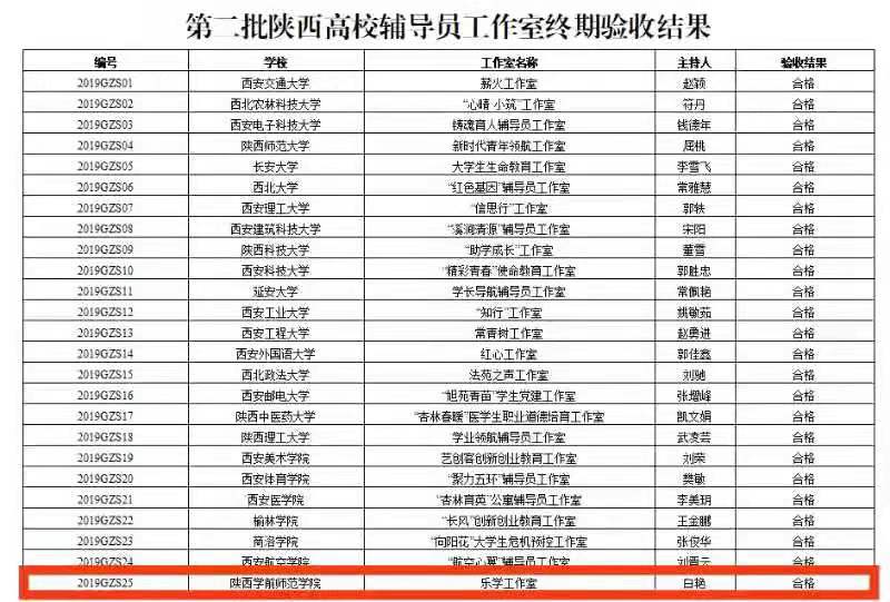 近日,中共陕西省委教育工委下发《中共陕西省委教育工委关于公布第二批陕西高校辅导员工作室终期验收结果和2019年陕西高校辅导员工作精品项目结项验收结果的通知》(陕教工〔2021〕174 号),经立项建设、中期考核、终期验收和结果公示等程序,bat365“乐学工作室”顺利通过终期验收并被授予“陕西高校省级辅导员示范工作室”,工作室主持人白艳同志被授予“陕西高校名优辅导员”荣誉称号。