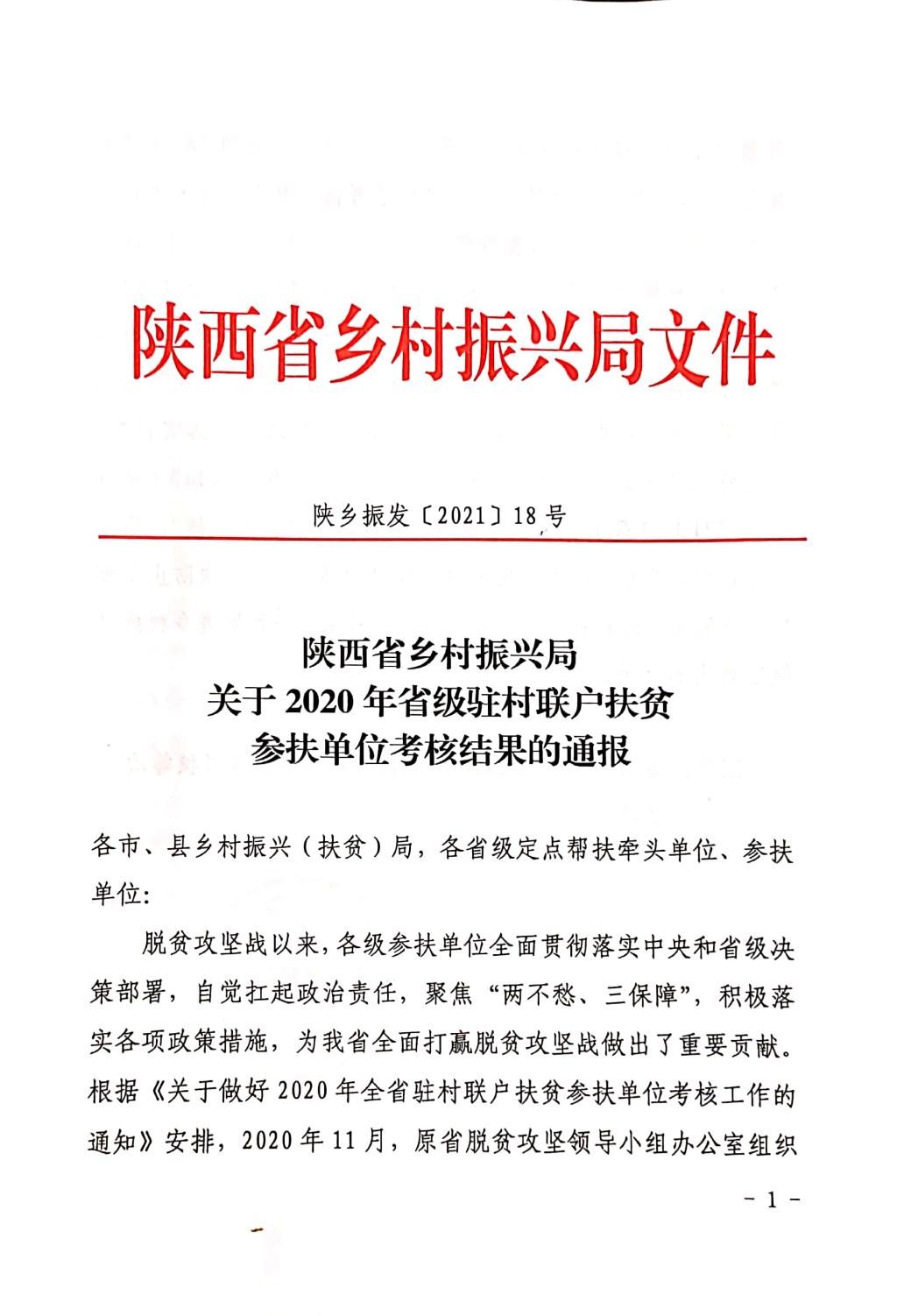 近日,陕西省乡村振兴局组织开展了全省驻村联户扶贫参扶单位考核工作,对省级参扶单位2020年驻村联户扶贫工作进行了考核,bat365喜获考核“优秀等次”。