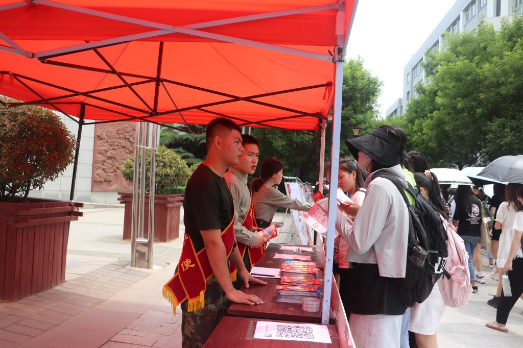 宣传台前,英姿飒爽的退役大学生吸引了众多学生前来咨询,武装部工作人员和退役学子们就同学们的提问做出了耐心细致的解答,全方位、多角度向同学们介绍了2021年大学生征兵入伍的流程、应征条件等,并详细讲解了精准征兵和参军优抚优待政策,使同学们进一步坚定了参军入伍、建功军营的决心。同时建立征兵微信群,纳入有意向入伍的学生,实时解疑答惑,强化跟踪帮扶,注重服务保障,充分实践“我为学生办实事”的服务育人精神。
