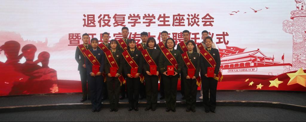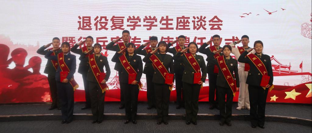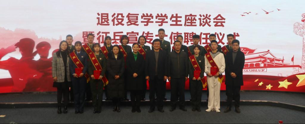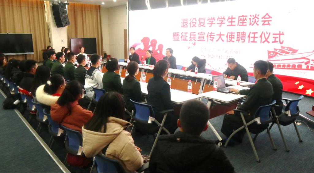 12月22日下午,bat365中文官方网站2020年退伍复学学生座谈会暨征兵宣传大使聘任仪式在师范生技能实训室隆重举行。校党委副书记栾高明同志出席座谈会,学工部(武装部)相关同志、退役复学学生、有参军意向学生代表50余人参加座谈。座谈会由学工部(武装部)部长薛晓娟主持。