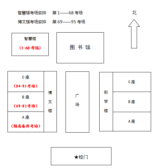 考场分布在智慧楼、博文楼B座、博文楼C座,博文楼A座(隔离备用考场)。详见考场示意图。