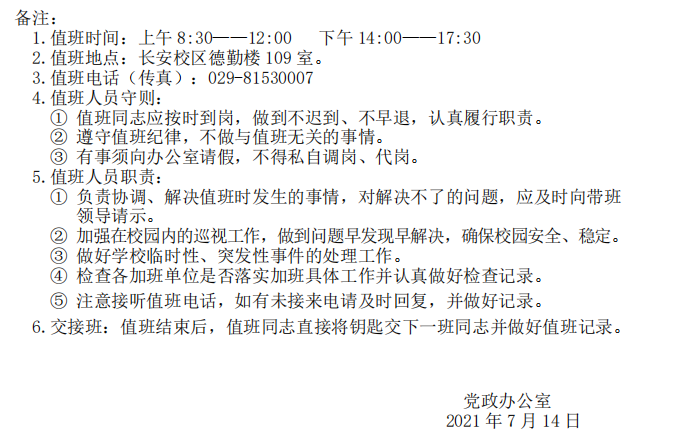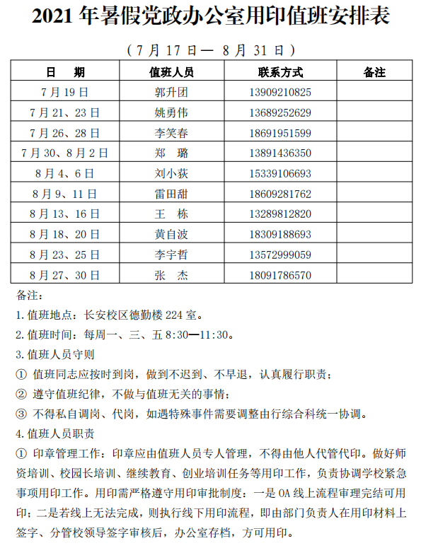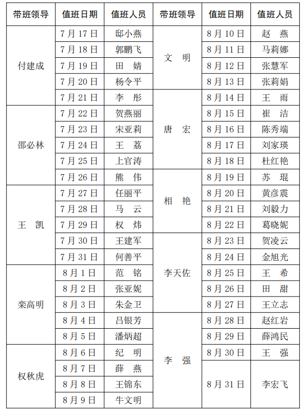 2021年暑假学校总值班表(2021年7月17日—8月31日)