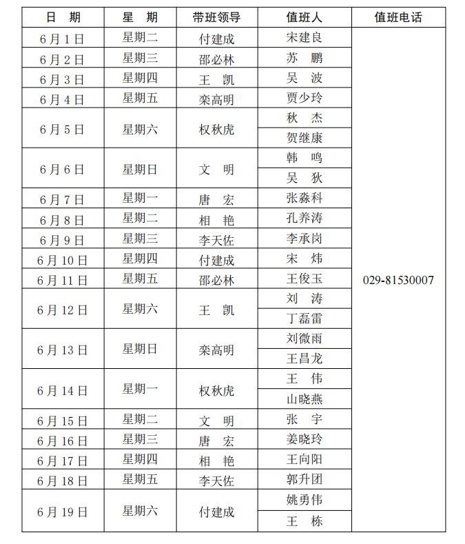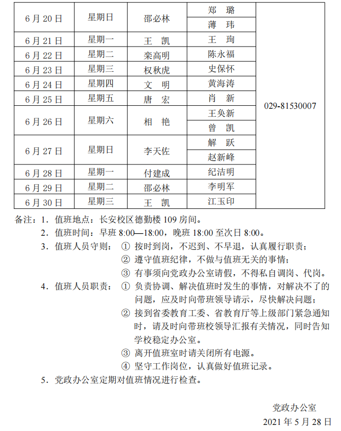bat365中文官方网站长安校区值班表(2021年6月1日—6月30日)