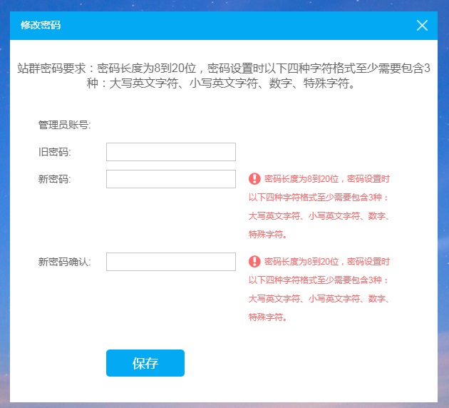 新版站群系统平台的后台管理密码与旧平台相同,但加强了密码安全管理措施,首次登陆新版站群系统平台时,如管理密码不符合安全强度要求或3个月未登陆系统平台,会弹出密码修改界面,请按要求进行修改。