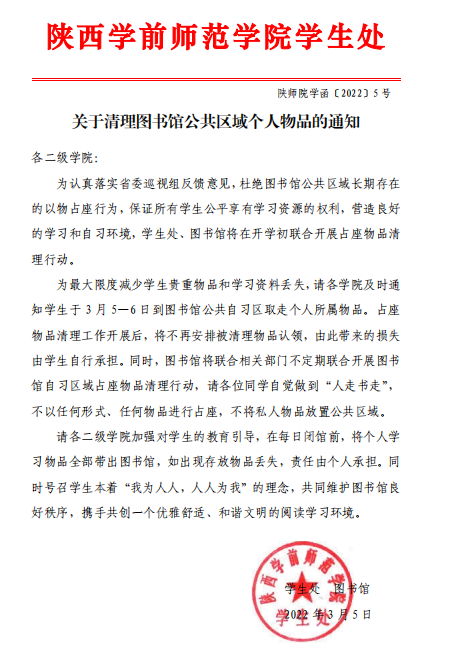 关于清理图书馆公共区域个人物品的通知