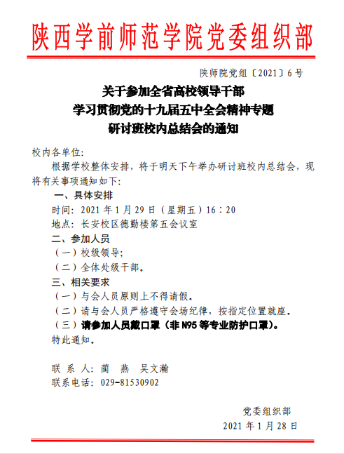 上一条:关于参加全省高校领导干部学习贯彻党的十九届五中全会精神专题研讨班校内总结会的通知