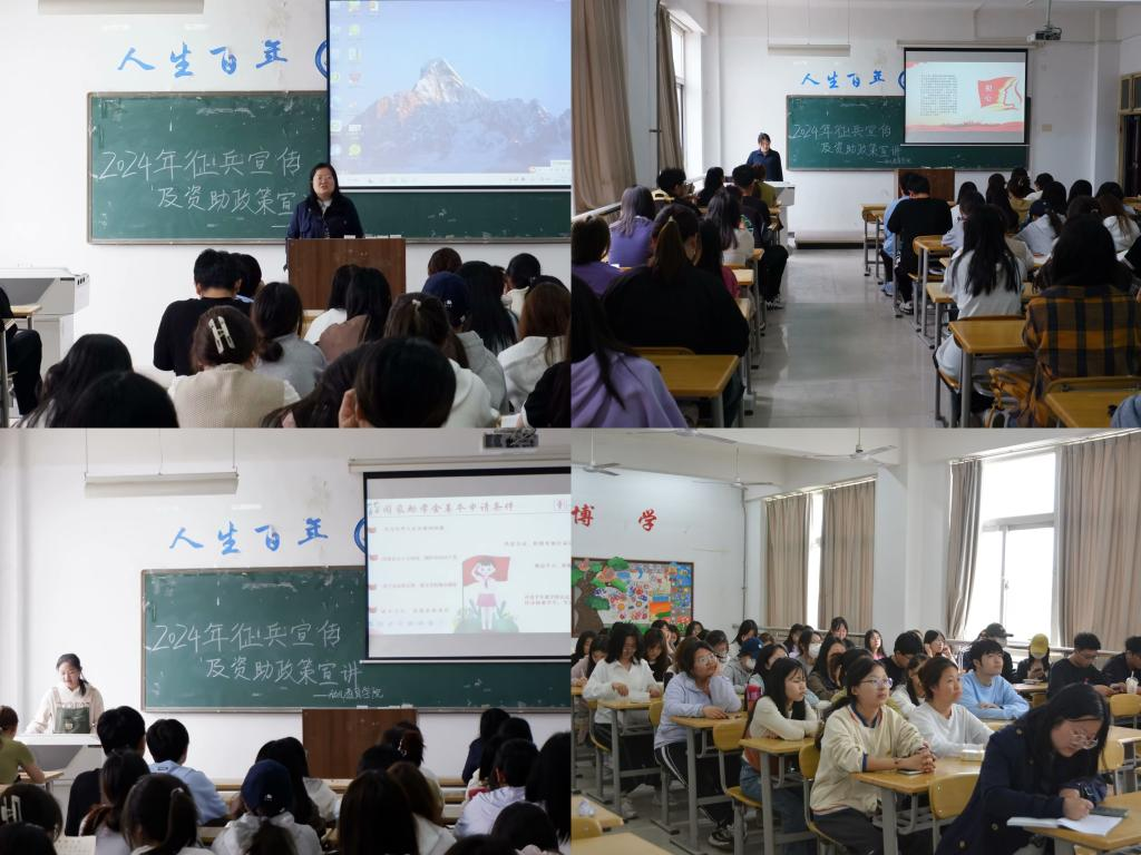 2024年4月10日下午14:30,幼儿教育学院于启真楼415教室开展“退役士兵风采展”及资助政策宣讲活动。学院退役士兵尚倩楠、资助宣传大使李怡欣两位同学进行宣讲。