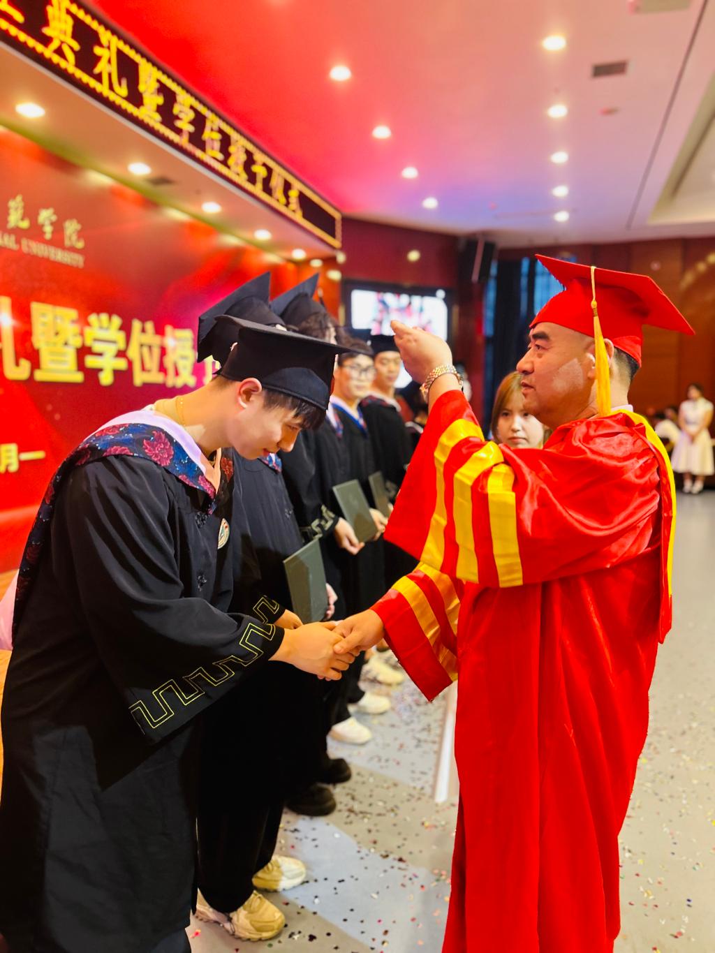 最后,美术学院副院长王希宣布了美术学院2024届毕业生学士学位授予名单。全体毕业生依次上台,院长金旭光为他们拨穗正冠、授予学位证书,毕业生们在悠扬的音乐中,与学院院长、老师们激动地合影留念。现场气氛温馨而热烈。祝福美术学院2024届毕业生前程似锦,一路生花!