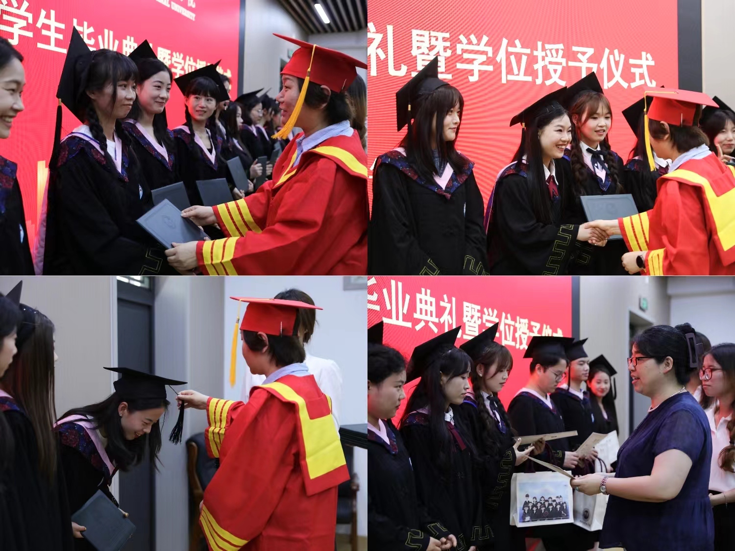 在庄严的学位授予仪式上,幼儿教育学院学委委员会的全体教师为现场参加学位授予的毕业生们颁发学位证书并扶正流苏。毕业生们向老师深深鞠躬,接过沉甸甸的学位证书,激动而兴奋。最后,毕业典礼在全体毕业生合唱的歌曲《稻香》和《起风了》落下帷幕,毕业生通过歌曲表达了他们对人生新起点的希望憧憬与对母校深深的不舍之情。仪式结束后,同学们有序离场,纷纷与老师们合影留念,留下了毕业季最美好的回忆。