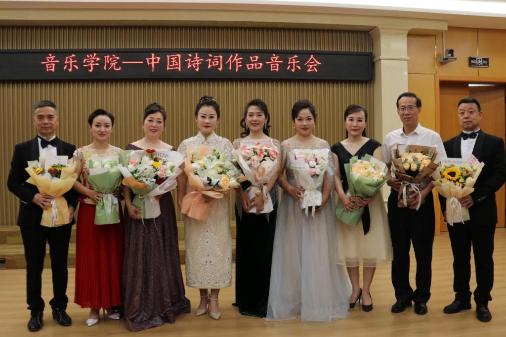 音乐会从诗经《周南·关雎》开篇,声乐教研室十名教师用精湛的演唱技巧、优雅大方又得体的台风,通过不同的音色和演唱风格,将每一首诗词都诠释得淋漓尽致,完美地呈现出诗词中的意境和情感,让观众仿佛置身于诗词的情境之中,一同感受诗词的抑扬顿挫、情感的跌宕起伏。现场观众被教师们的表演深深打动,不时爆发出热烈的掌声和喝彩声。