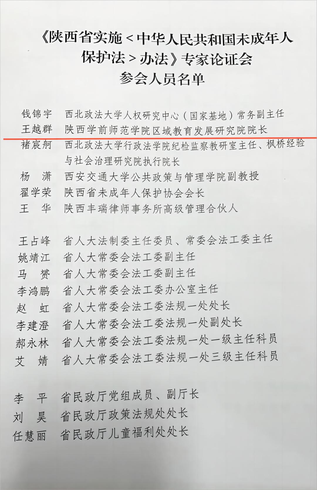 5月8日,由陕西省人大常委会法制工作委员会举办的《陕西省实施〈中华人民共和国未成年人保护法〉办法(修订草案第三次审议稿)》专家论证会在省人大顺利举行。本次会议由省人大法制委主任委员、常委会法工委主任王占峰主持,省人大常委会法工委副主任姚靖江、马赟及法工委办公室有关负责人及干部参加会议,省民政厅党组成员、副厅长李平及政策法规处与儿童福利处处长等领导出席,来自民进省直工委主委、校民进总支主委、校老教授协会会长、校区域教育发展研究院教授王越群,以及西安交通大学、西北政法大学、陕西省未成年人保护协会、陕西丰瑞律师事务所等院校和机构的6名专家学者应邀参加本次专家论证会。